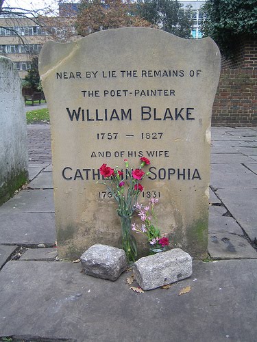 According to a book published around the time of Blake’s death in 1827, “Blake died in his sixty ninth year, in the back room of the first floor of No. 3 Fountain Court, Strand, and was buried in Bunhill Fields, on the 17th of August.” He was buried in an unmarked grave. In 1927, on the centenary of Blake’s death, one of his biographers finally erected a memorial stone over his grave. Unfortunately, the wording for the stone was a little confusing. The stone, which can still be seen today, reads: